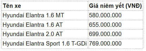 Dưới đây là bảng giá xe Elantra cho từng phiên bản: