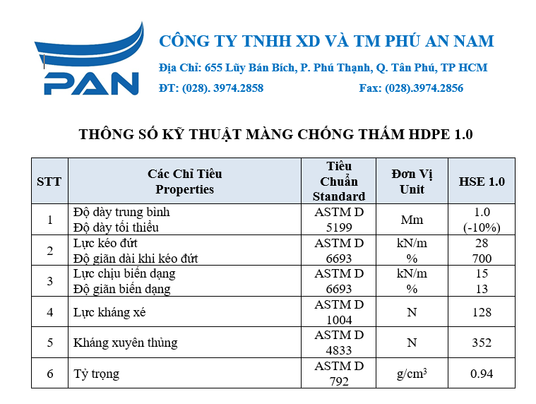 Thông số kỹ thuật màng chống thấm HDPE 1.0mm
