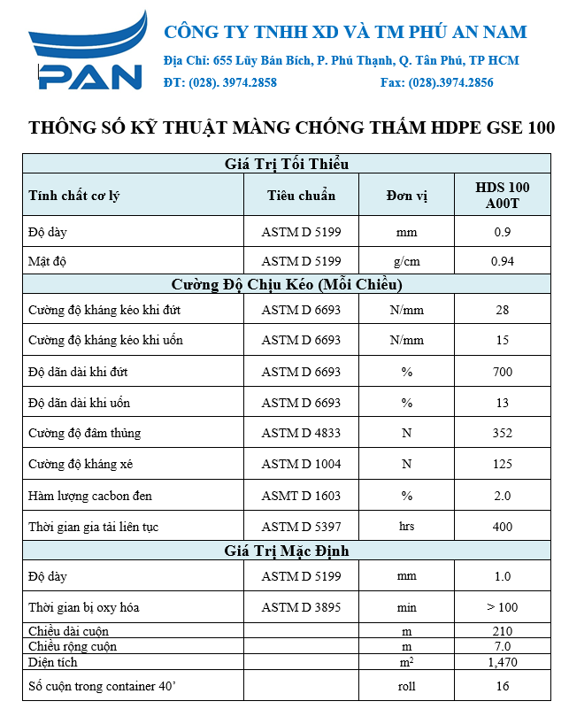 – Màng chống thấm HDPE GSE HD1.0 do Phú An Nam cung cấp được nhập khẩu 100% từ Thái Lan.